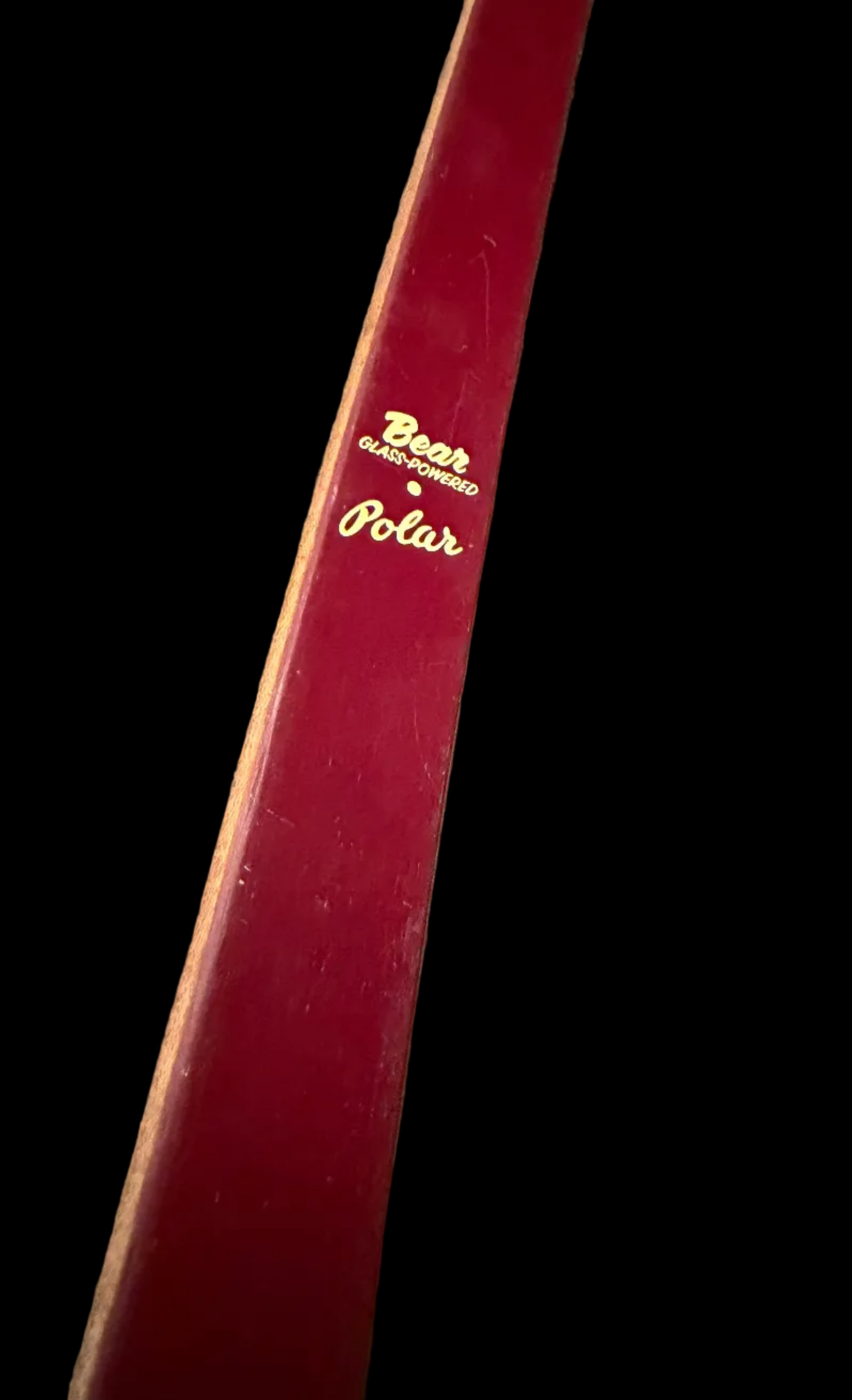 Classic Bear Polar recurve in solid shooter condition. Original glass-powered limbs with no cracks or delamination. Tips are clean and straight, and the bow tracks well. Riser shows finish wear from use, and the medallion is missing, but there are no structural issues. Decals are intact and legible.