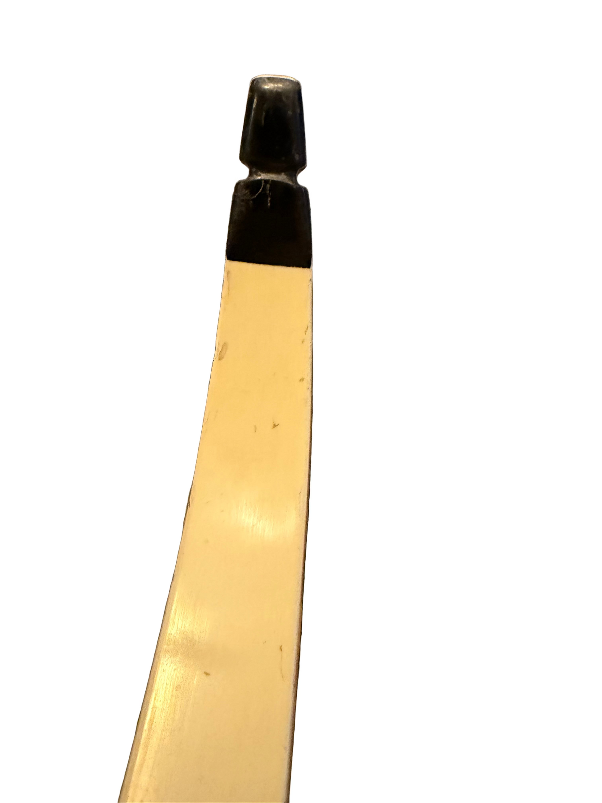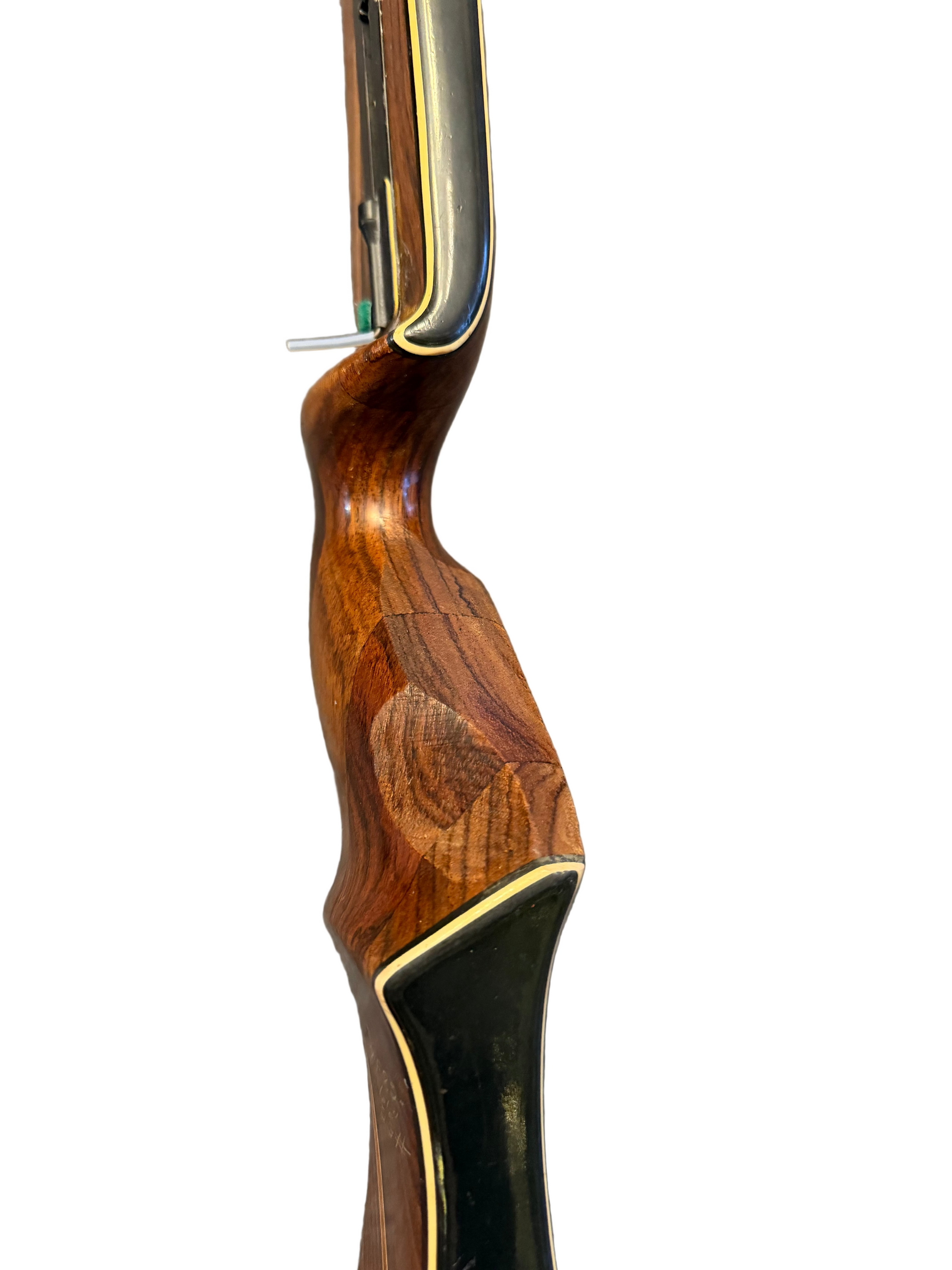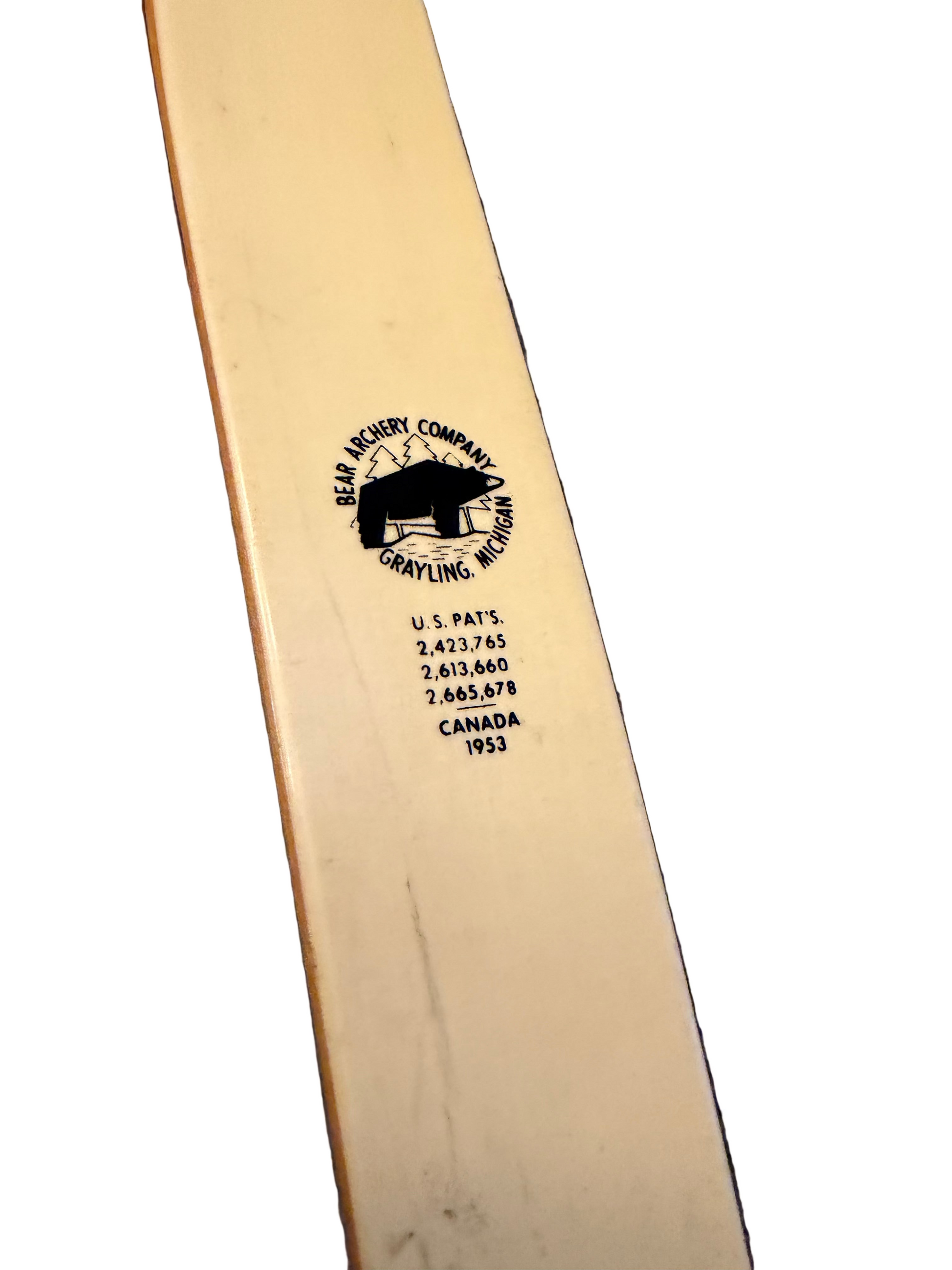 Beautiful example of a vintage Bear Tamerlane target recurve. This bow is straight, solid, and in good shooting condition with white glass and sharp, original tips. Decals and Grayling-era stamp are intact and clear. The riser shows excellent wood grain and classic Tamerlane geometry.