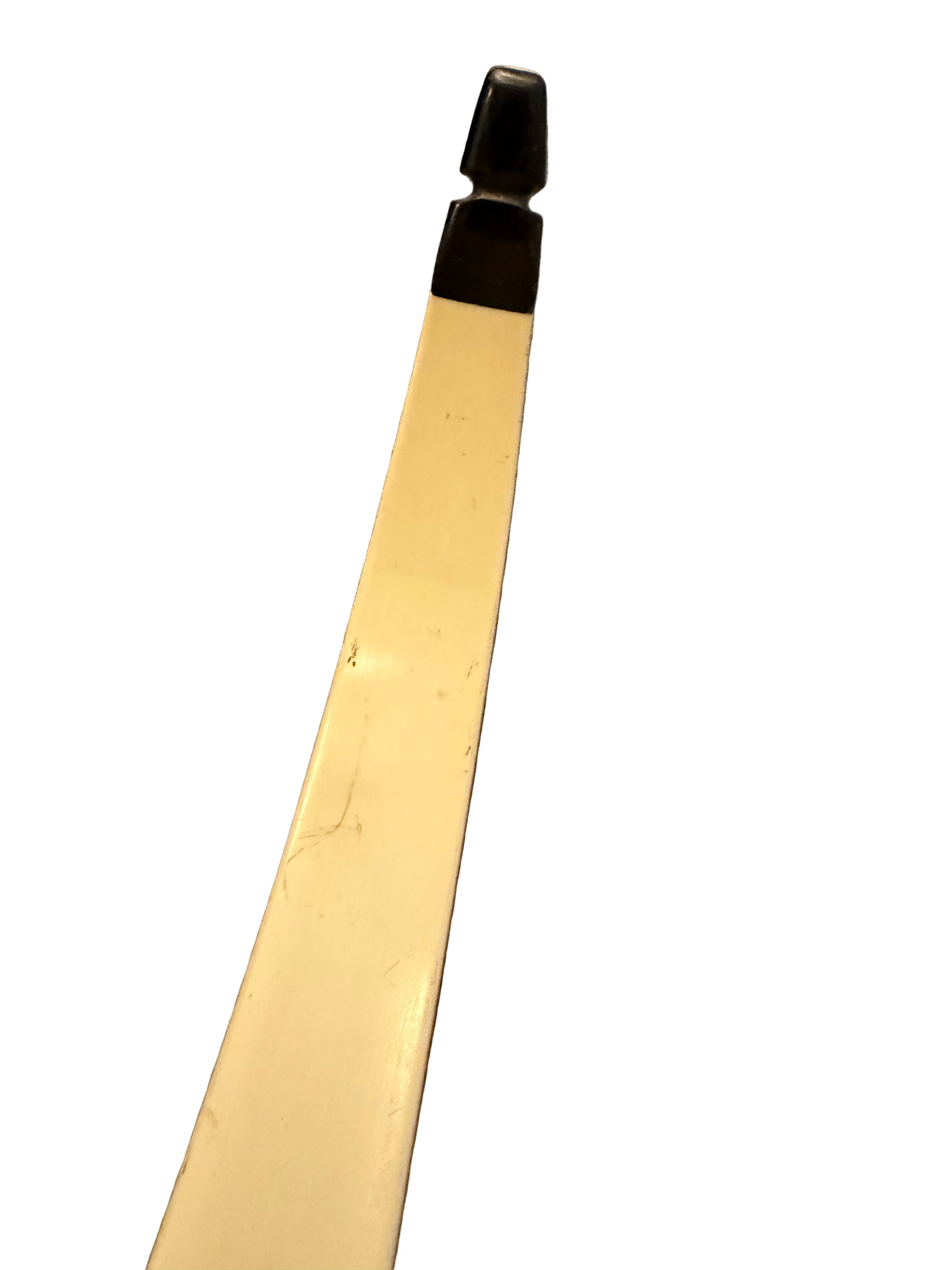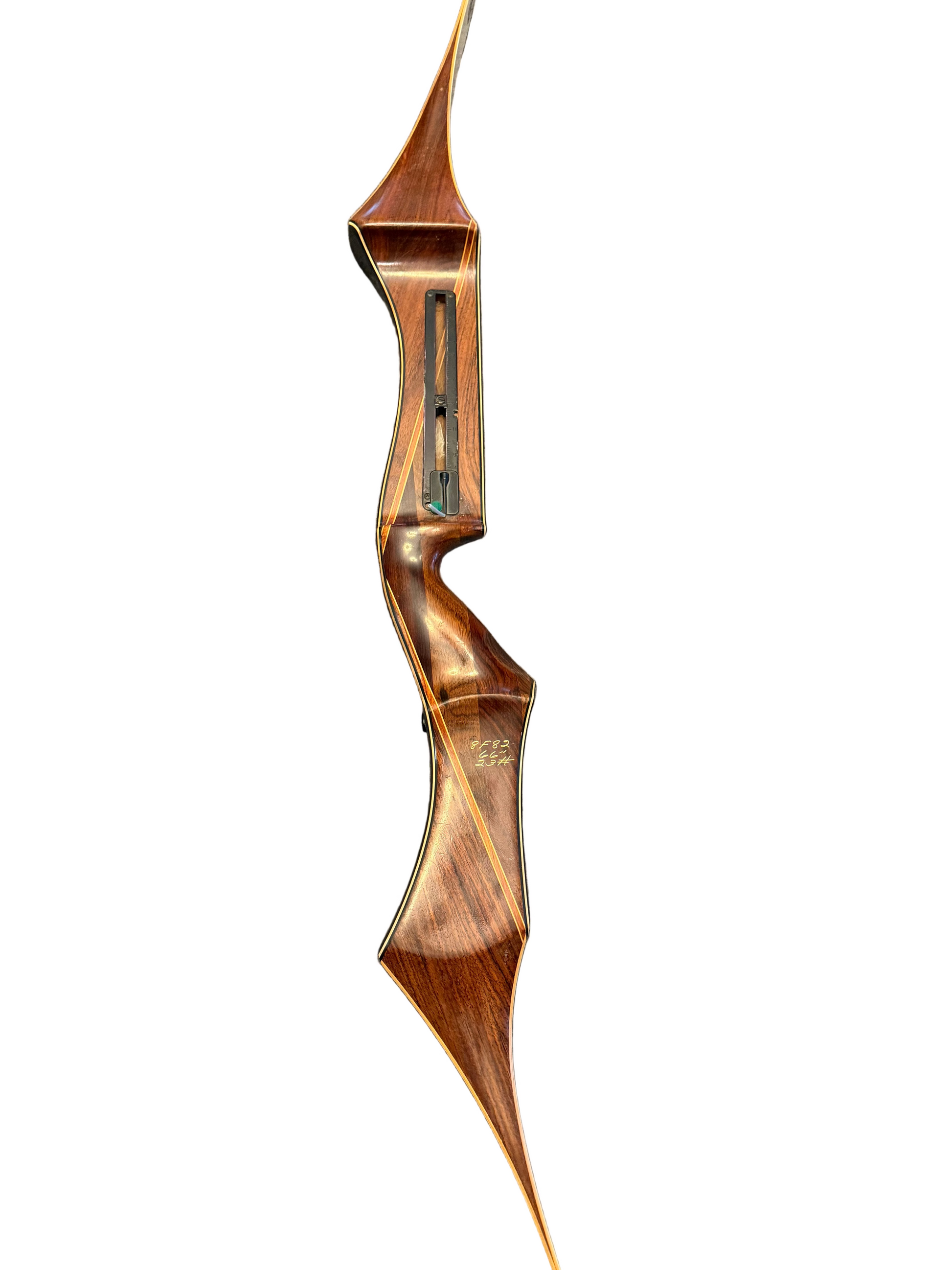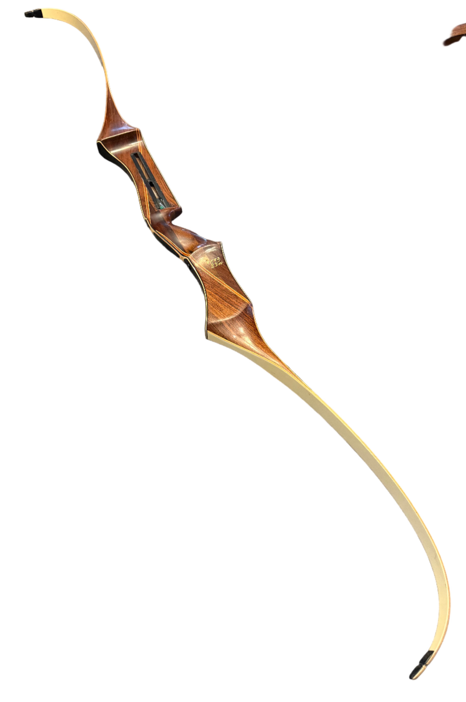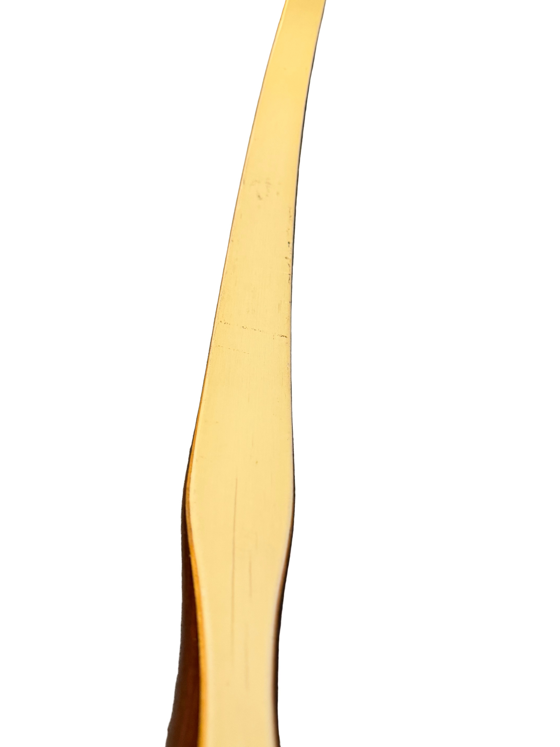 Beautiful example of a vintage Bear Tamerlane target recurve. This bow is straight, solid, and in good shooting condition with white glass and sharp, original tips. Decals and Grayling-era stamp are intact and clear. The riser shows excellent wood grain and classic Tamerlane geometry.
