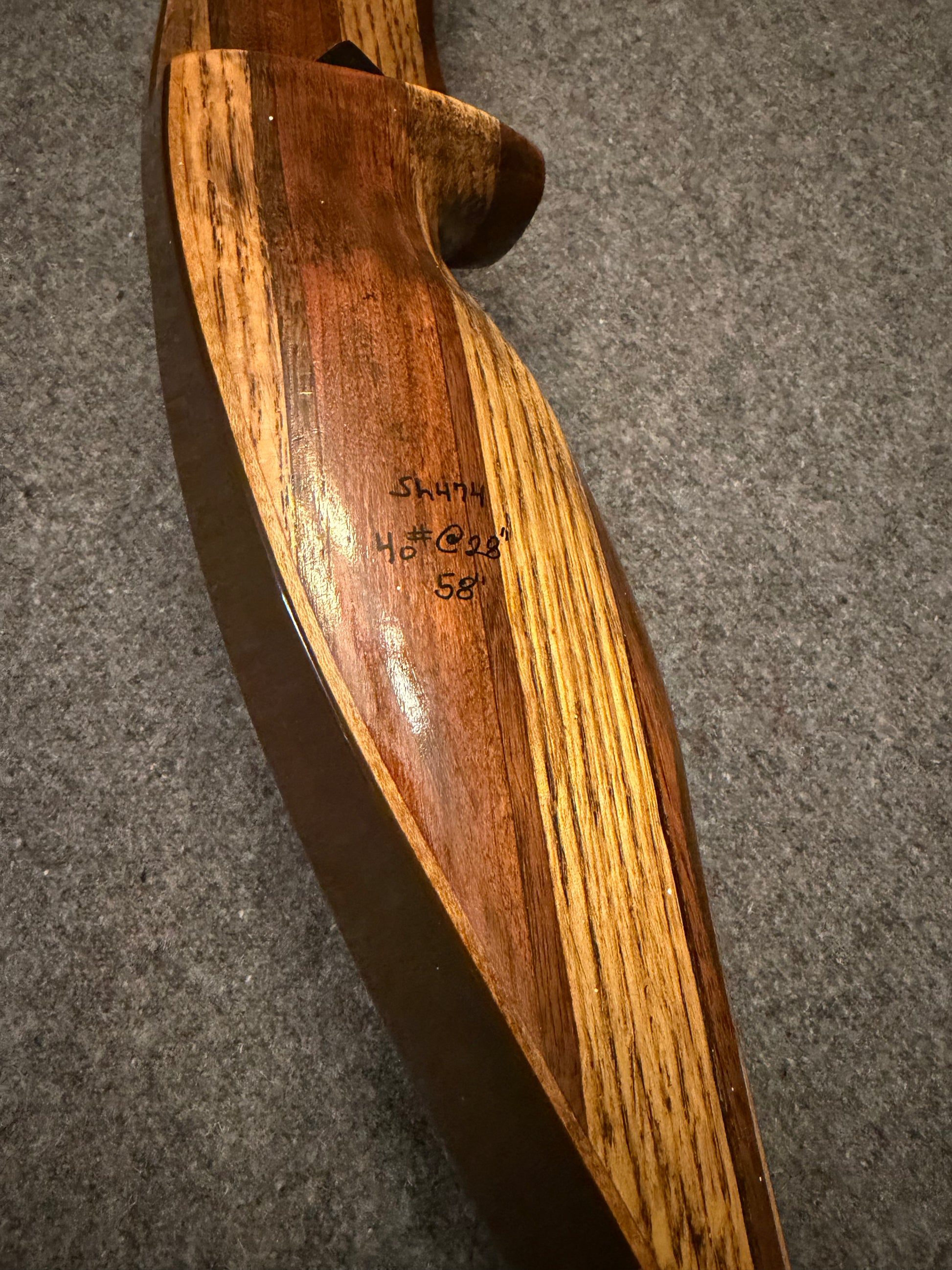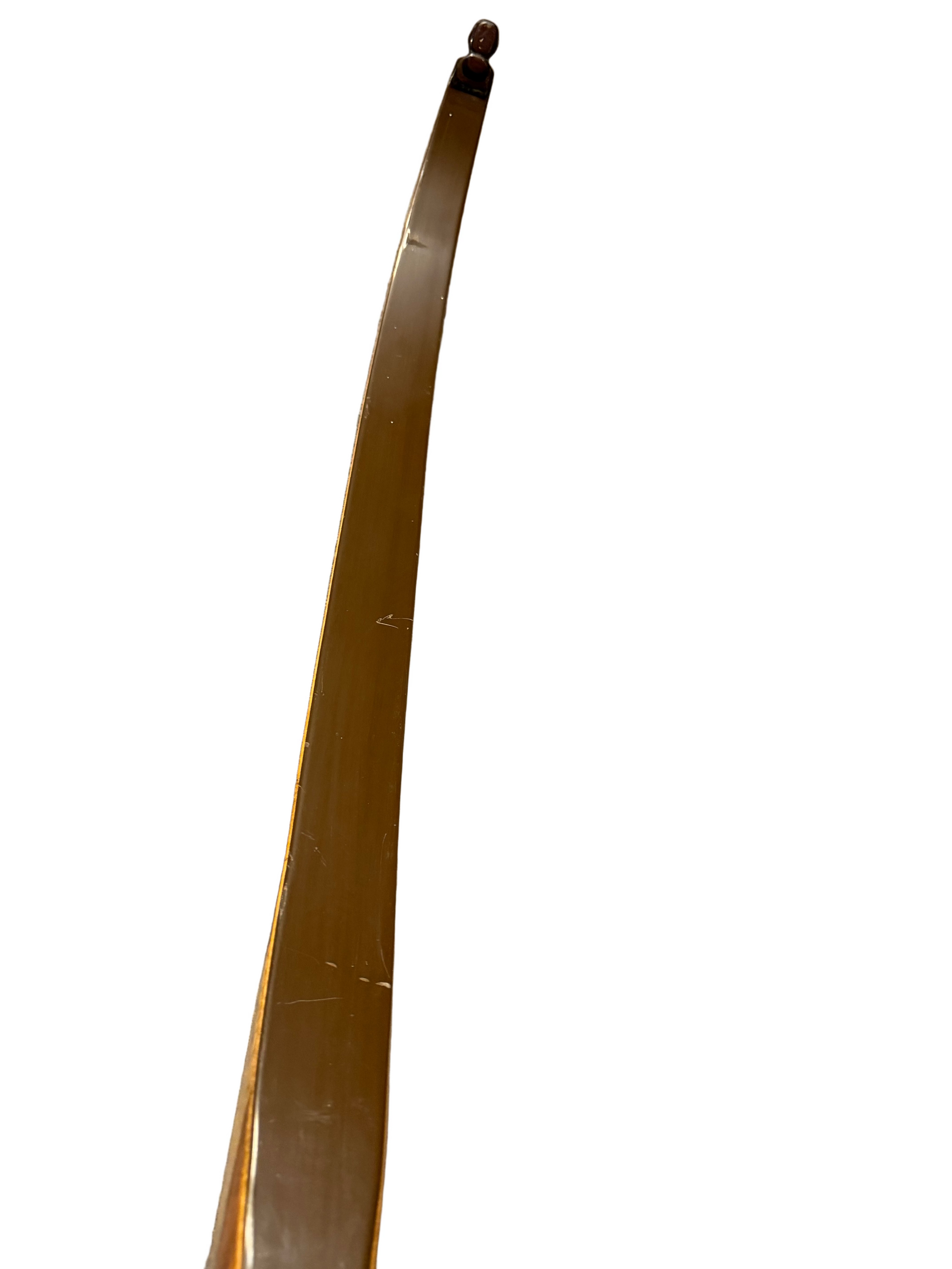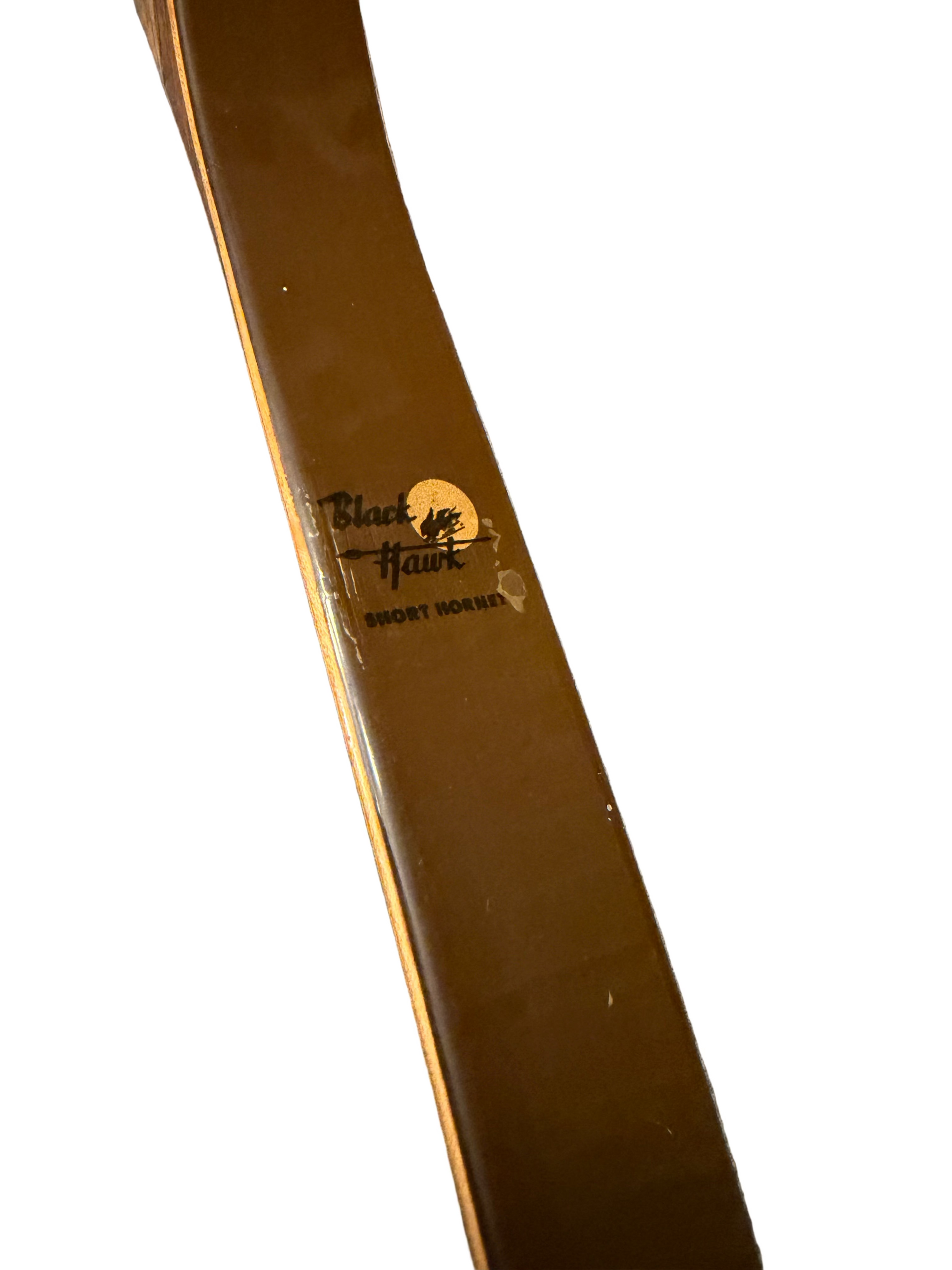Vintage Black Hawk Short Hornet, 58” and marked 40# @ 28”. The riser is in great shape with gorgeous multi-tone wood and clean lines. Limbs are straight with no twist.