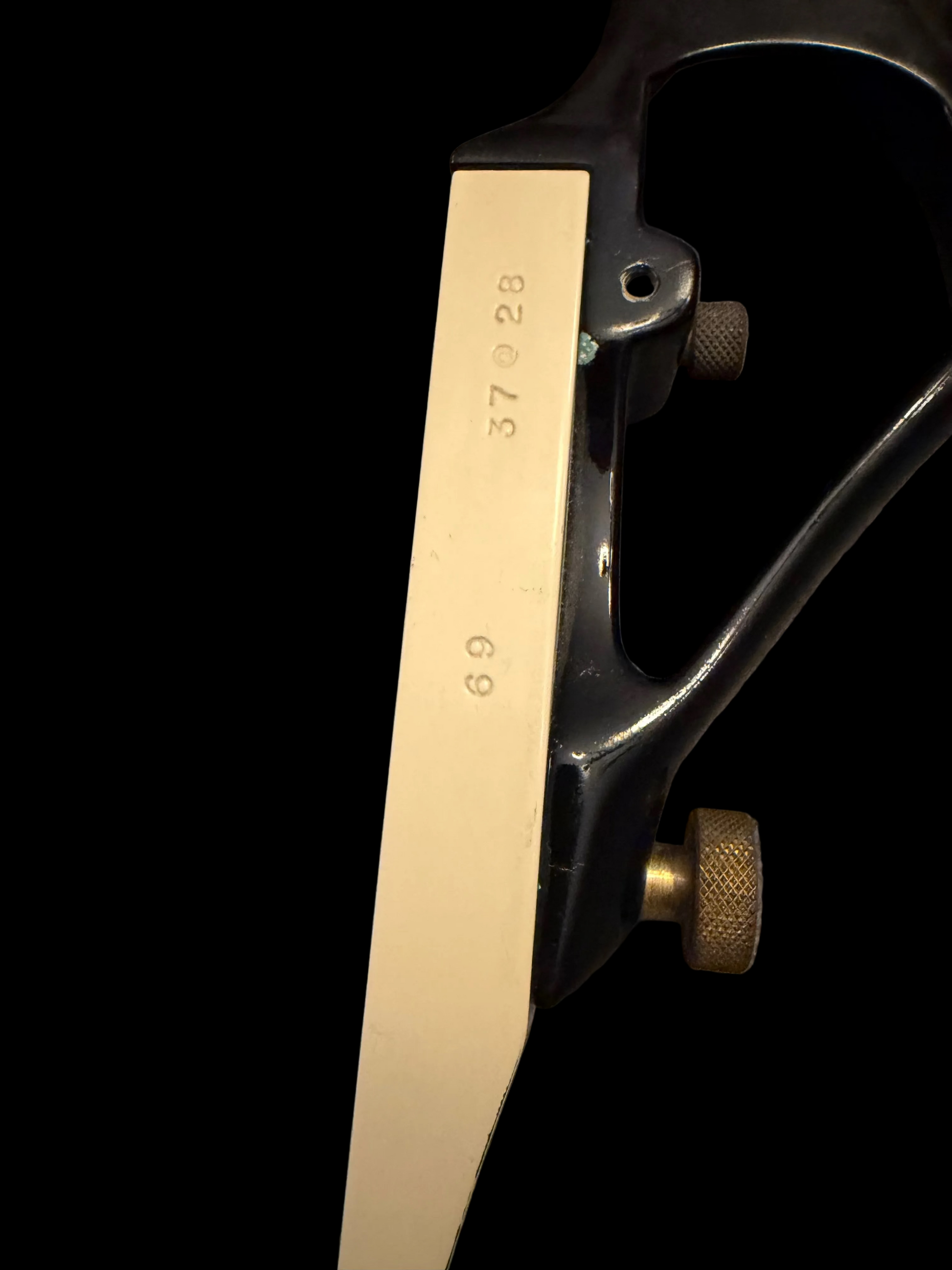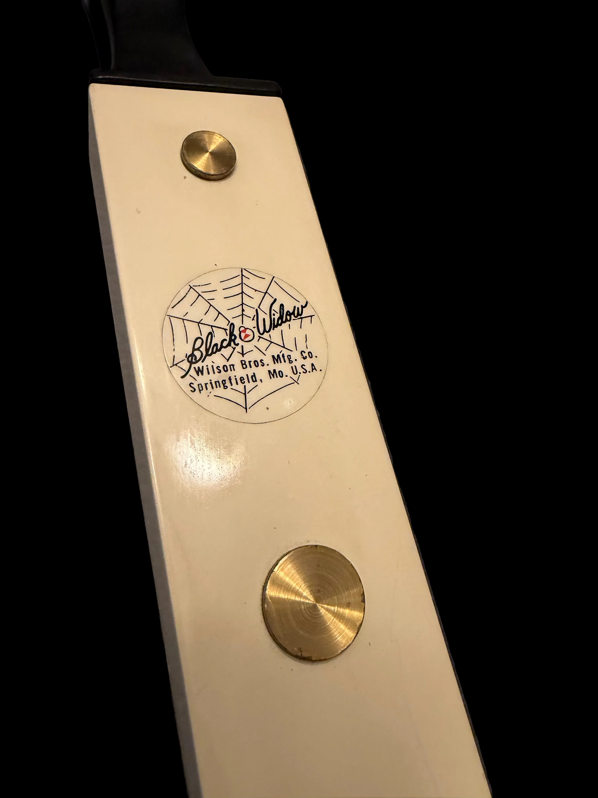 Early Wilson Bros. era Black Widow Model 1225 with black anodized aluminum riser, white glass limbs, and original brass hardware. Marked 37# @ 28”. Straight limbs, solid riser, clean spider logo decal. Normal cosmetic wear consistent with age, no cracks or structural issues noted. A classic early Black Widow that’s fully shootable and collectible.