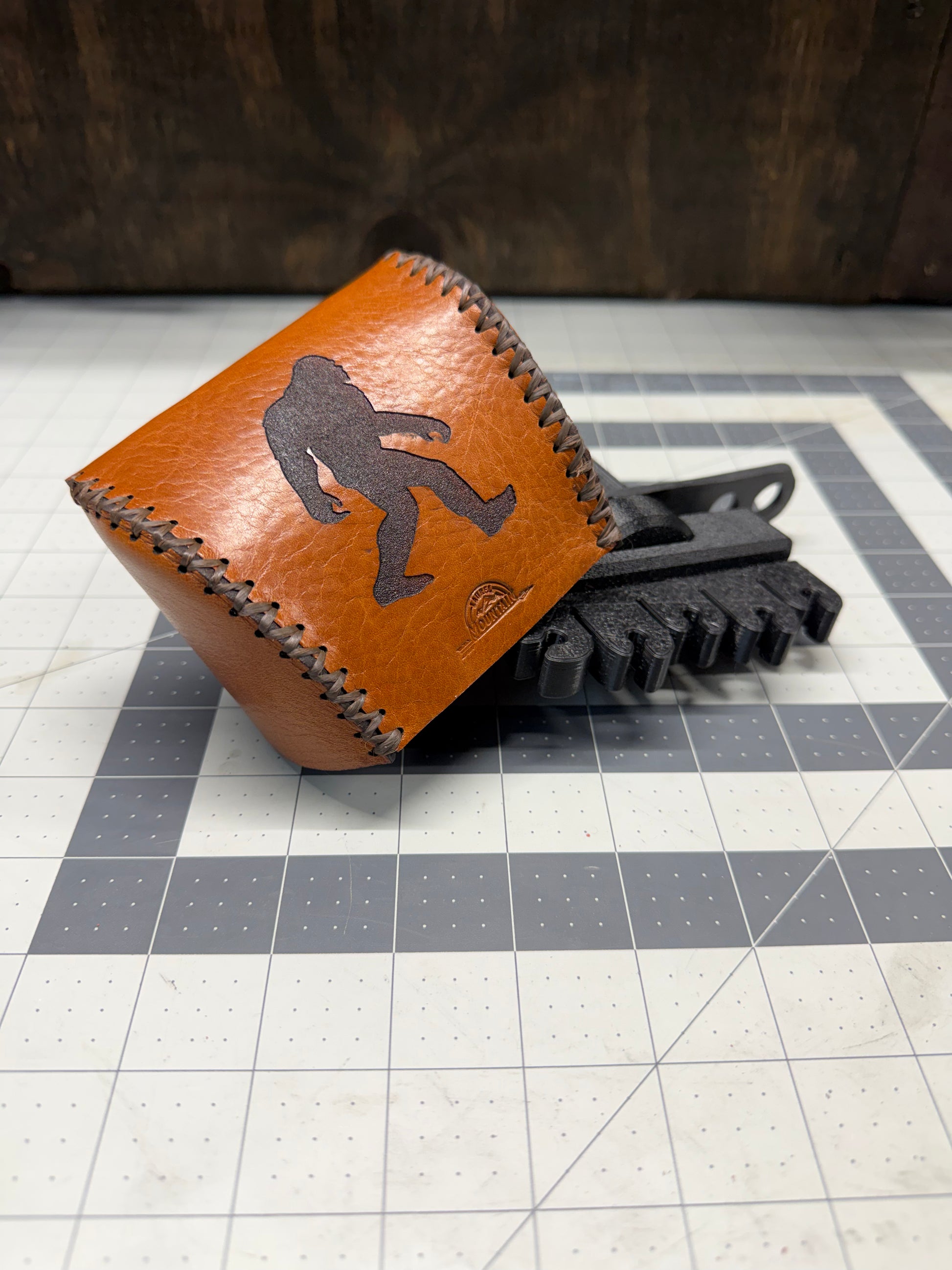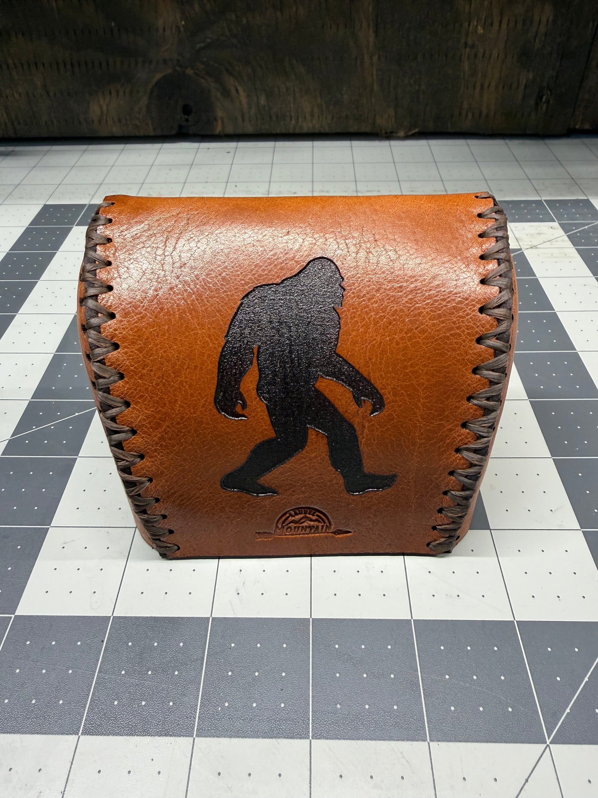 - Laser engraved Sasquatch on saddle tan leather with brown stitching