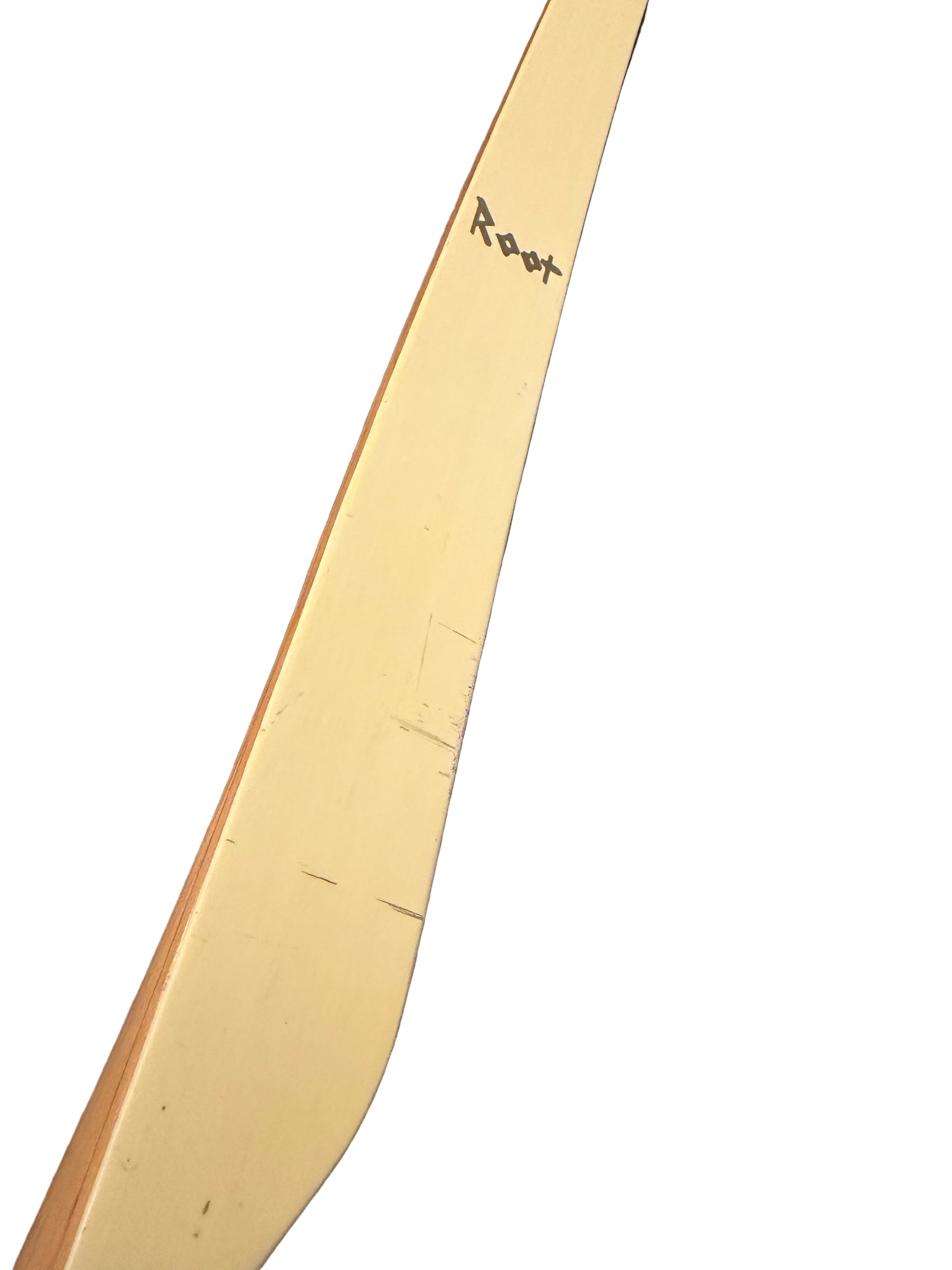 Classic Root Rover recurve in solid shooting condition. The bow is straight with good tips and smooth limb alignment. Original white glass does show expected age marks, scratches, and small wear spots, but nothing structural. Riser wood is clean with only light handling marks.