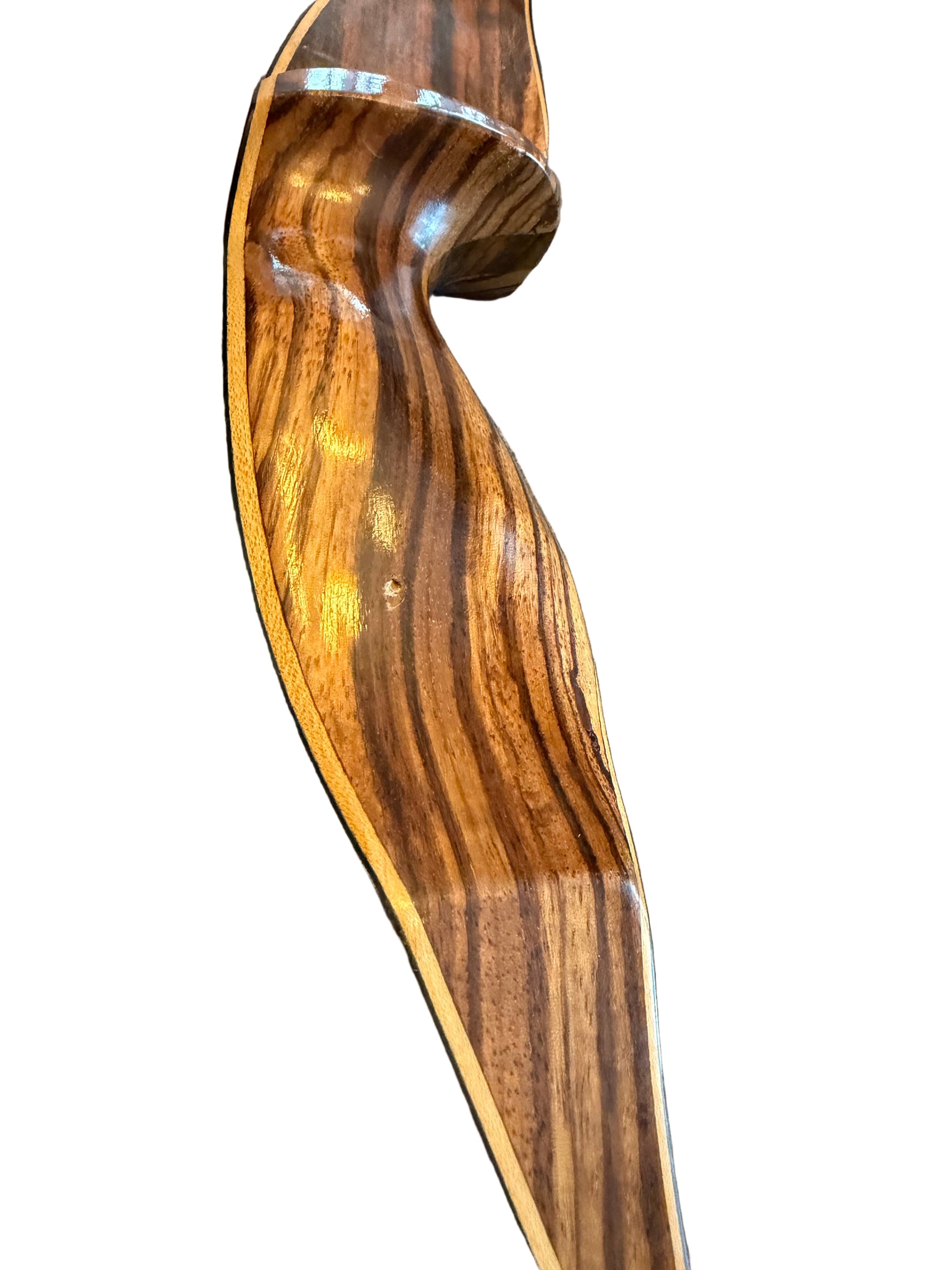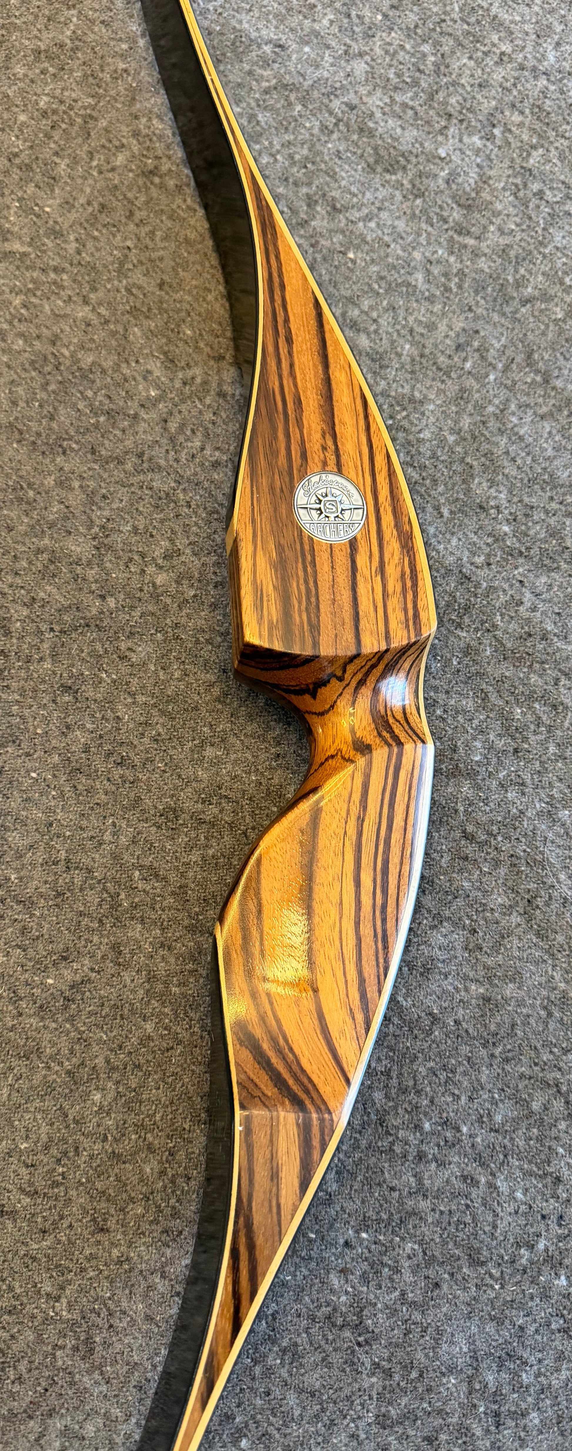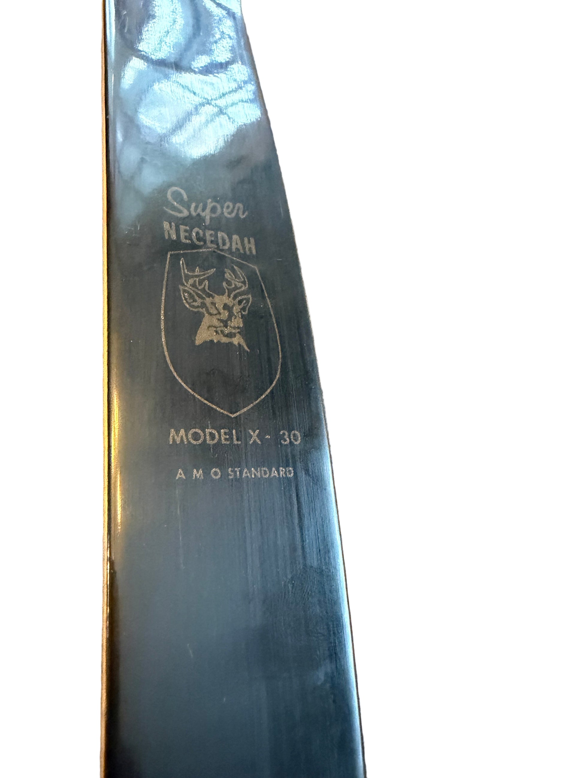 Beautiful vintage Shakespeare Super Necedah (Model X-30) in excellent shooting shape. Limbs are straight, tips are clean, and the finish is smooth with only light surface wear. The riser shows gorgeous grain with one small cosmetic blemish on the handle (pictured), purely surface-level and not structural. Decals and markings are intact: 40# @ 28”.