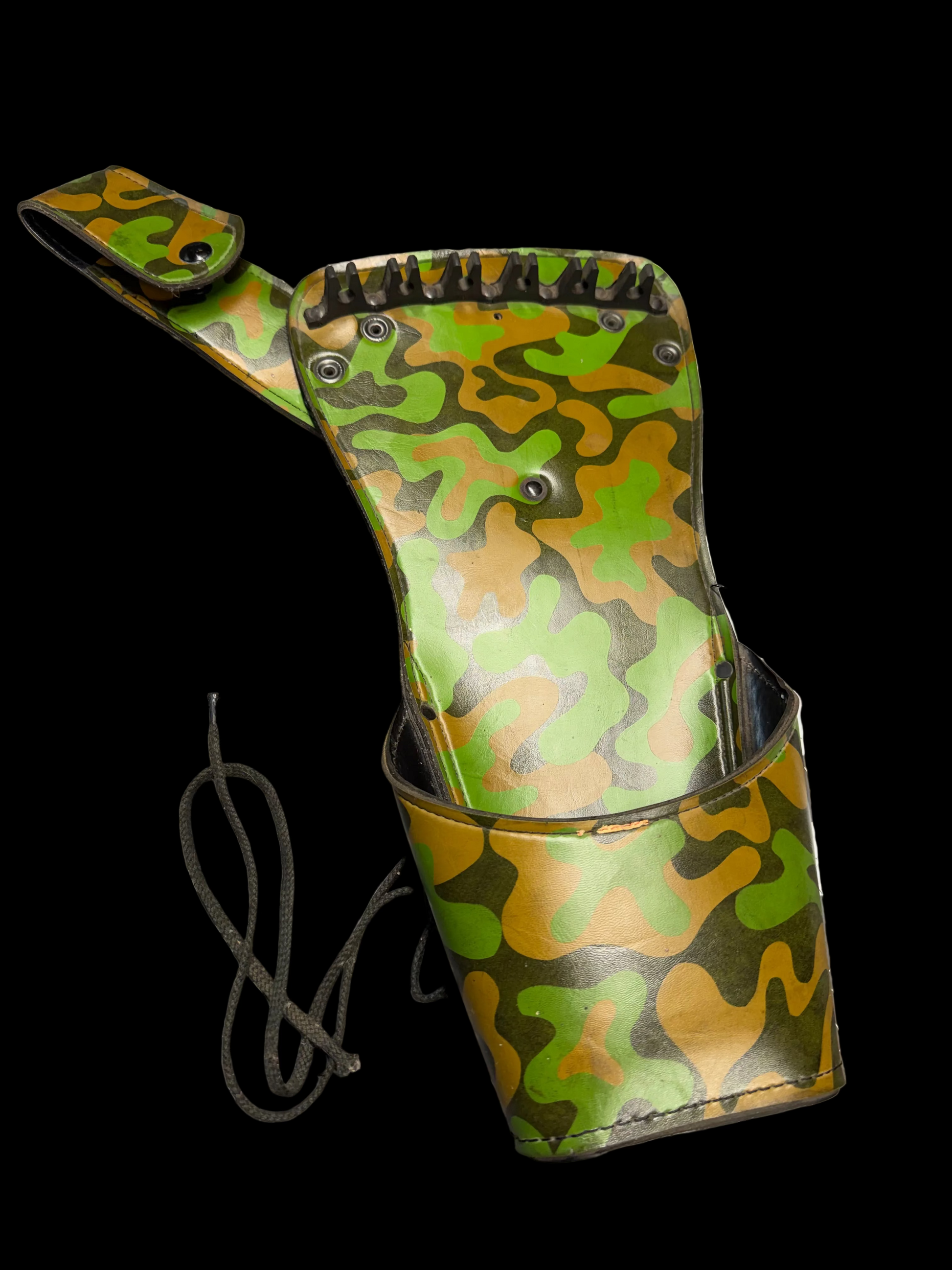 This example is in excellent condition with minimal wear—camo finish remains bright, rubber gripper teeth are intact, stitching and hardware are solid, and all snaps function properly. A well-made, practical quiver from the late 1970s–1980s bowhunting era that’s ready to use or add to a vintage archery setup.